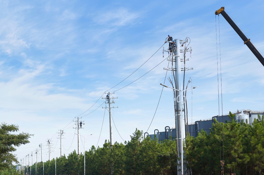 国网樟树市供电公司施工人员正在大桥街道办事处盐化基地新建盐化基地单杠四回线路。龚可欣 摄