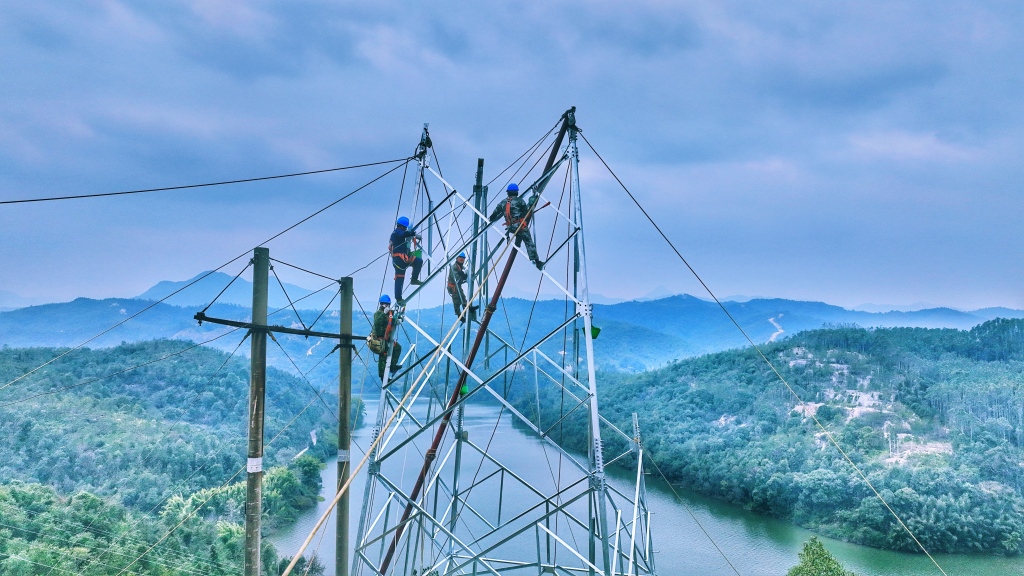 2024年12月13日,赣州公司施工人员采取附着式抱杆组立配网”123“工程35千伏信上线75号铁塔。彭声彬 摄