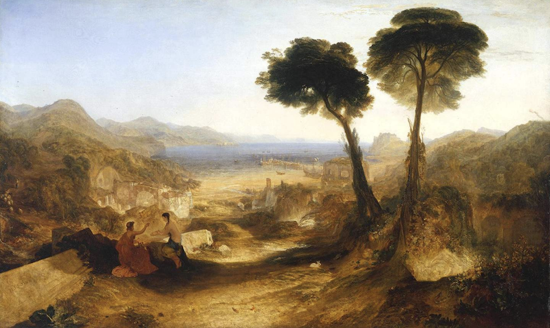 那么,谁在这一展览中胜出了?在传统观念中,透纳的画中“诗意”胜过了康斯太勃尔描绘的“散文”。透纳是个十足的旅行家,总是四处寻觅壮丽的远方。他也是个古怪的艺术家,在工作室里装了个窥视孔,以便偷窥访客。在创作上,他对铬黄有着异乎寻常的喜爱。展览中,作品《古意大利:奥维德被逐出罗马》上一次在伦敦展出还要追溯到二十世纪七十年代。这件作品既充满魔幻色彩又略显怪诞,仿佛是对另一个星球上生物的未来主义描绘。